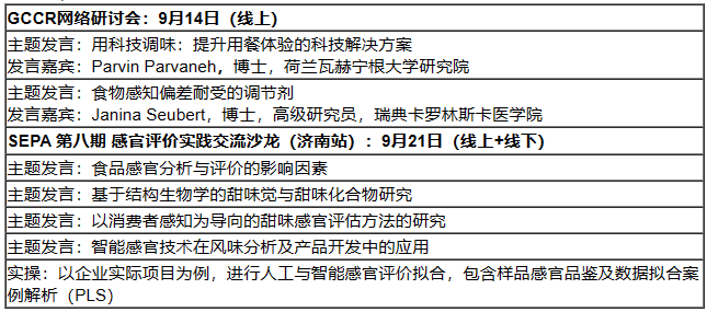 9月14日,GCCR網(wǎng)絡(luò)研討會邀請到來自瑞典卡羅林斯卡醫(yī)學(xué)院和荷蘭瓦赫寧根大學(xué)的年輕學(xué)者做線上學(xué)術(shù)報告。9月21日,SEPA 第八期感官評價實踐交流沙龍在中國·山東·濟(jì)南線下邀請食品行業(yè)感官專家進(jìn)行相關(guān)經(jīng)驗分享交流,同步線上直播。