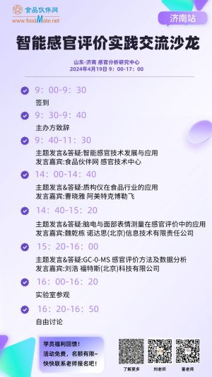 2024年4月19日,食品伙伴網(wǎng)、感知網(wǎng)聯(lián)合濟南智感分析儀器有限公司、濟南聯(lián)食檢測科技有限公司將在濟南舉辦第九期感官評價實踐交流沙龍。