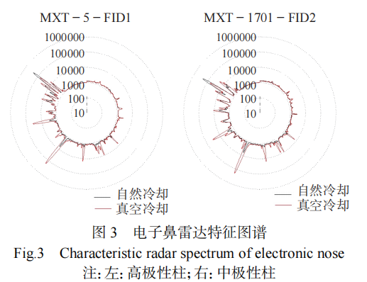 本實(shí)驗(yàn)采用 HS-SPME-GC-MS 和氣相電子鼻對(duì)自然冷卻和真空冷卻的醬牛肉中揮發(fā)性化合物進(jìn)行了分析,兩種醬牛肉中共檢測(cè)到 92 種揮發(fā)性風(fēng)味化合物,其中,自然冷卻的醬牛肉中共檢測(cè)到 76 種,真空冷卻的醬牛肉中共檢測(cè)到 68 種,包括酯類、醇類、醚類、酮類、醛類、烴類、酸類、酚類和雜環(huán)類化合物。結(jié)果表明,真空冷卻能夠在一定程度上減少醬牛肉在自然冷卻過程中產(chǎn)生的一些具有刺激性氣味的化合物,如乙酸、異戊醇等,同時(shí)增加了甜香味。真空冷卻的醬牛肉在保留香辛料氣味方面比自然冷卻的醬牛肉更有優(yōu)勢(shì),且兩種不同冷卻方式處理的醬牛肉氣味存在差別,可以通過快速氣相色譜電子鼻進(jìn)行快速鑒別。