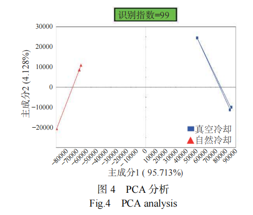 將本實(shí)驗(yàn)電子鼻數(shù)據(jù)做主成分分析,如圖 4 所示。第一主成分的方差貢獻(xiàn)率為 95.713%,第二主成分的方差貢獻(xiàn)率為4.128%,兩個(gè)主成分的貢獻(xiàn)率之和達(dá)到 99.841%,能夠很好地反映樣品實(shí)際情況。同時(shí),識(shí)別指數(shù)(discrimination index, DI)是用來表征樣品之間區(qū)分度大小的一種判斷方法,有效范圍在 80~100,且值越高說明得到的數(shù)據(jù)效果越好。在本實(shí)驗(yàn) PCA 分析中,識(shí)別指數(shù)達(dá)到 99,說明自然冷卻的醬牛肉和真空冷卻的醬牛肉可以很好地區(qū)分出來,且效果較佳。在主成分分析中,樣品之間相對(duì)距離越遠(yuǎn),表明樣品間氣味差異越大,從圖中可以看出兩種冷卻方式處理的醬牛肉之間距離較遠(yuǎn),在第一主成分方向顯示出明顯的分離,表明兩種醬牛肉氣味差異較為顯著,可以被很好地區(qū)分。
