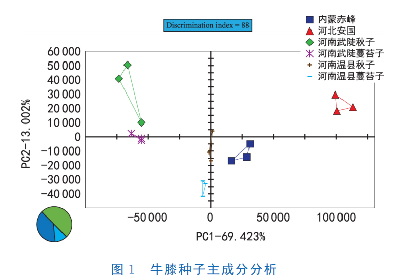 圖1為不同產(chǎn)地、不同類(lèi)型牛膝種子的主成分分析圖。由圖1可知,PCA區(qū)分指數(shù) 為 88,區(qū)分指數(shù)框?yàn)榫G色,表明區(qū)分有效。第一PCA(PC1)的累積貢獻(xiàn)率為69.423%,第一PCA(PC1)和第二PCA(PC2)的累積貢獻(xiàn)率之和為82.425%,表明牛膝不同炮制品氣味的差異主要由PC1決定。