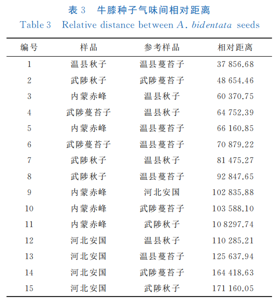 表3為樣品氣味兩兩間相對(duì)距離表。樣品間的相對(duì)距離越近,則整體氣味越接近,反之亦然。由表3可知,溫縣秋子與溫 縣蔓苔子的相對(duì)距離最近(37859.68),其次是武陟秋子與武陟蔓苔子(48654.46),秋子與蔓苔子是牛膝的2種不同繁殖類(lèi)型的種子,其整體氣味較相近,符合實(shí)際生產(chǎn)規(guī)律。而河北安國(guó)與武陟秋子相對(duì)距離最遠(yuǎn)(171160.05),即其氣味與武陟秋子差異最大。