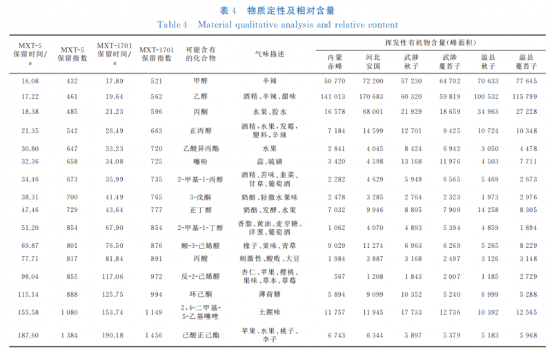 用AroChembase數(shù)據(jù)庫(kù)對(duì)樣品中的揮發(fā)性化合物進(jìn)行定性分析,其可能含有的化合物如 表 4所 示。由表4可知,不同牛膝種子樣品的揮發(fā)性氣味化合物在含量上存在差異。牛膝種子中揮發(fā)性化合 物etha-nol平均含量最高,峰面積范圍為59819~170;揮發(fā)性化合物(E)-2-hexenal平均含量最低,峰面積范圍為567~1185。武陟秋子和蔓苔子的揮發(fā)性氣味化合物在含量上較為接近,溫縣秋子和蔓苔子的揮發(fā)性氣味化合物在含量上也較為接近,說(shuō)明秋子與蔓苔子的揮發(fā)性氣味化合物較為相似。不同來(lái)源牛膝種子的氣味化合物含量差異較大,證明Heracles Ⅱ超快速氣相電子鼻能夠快速準(zhǔn)確地識(shí)別出不同來(lái)源牛膝種子之間的差異,牛膝種子檢測(cè)提供了新技術(shù)。