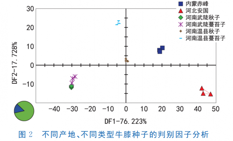 對(duì)不同產(chǎn)地、不同類(lèi)型的牛膝種子進(jìn)行判別因子分析,結(jié)果如圖2所示,6種樣品均能被較好地區(qū)分。武陟秋子與武陟蔓苔子較相近,二者區(qū)分效果較差。
