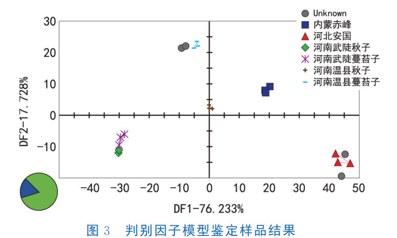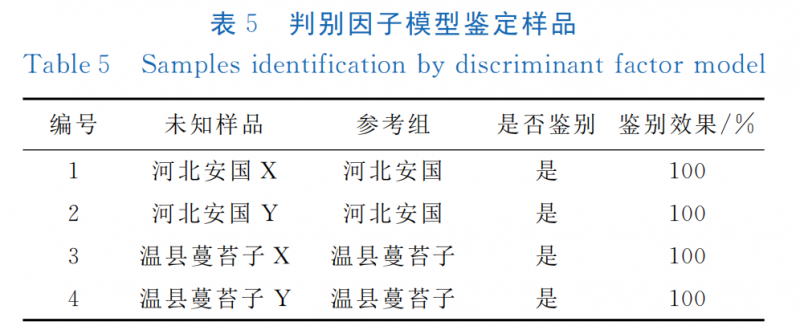 未知樣品分別為屬于河北安國(guó)樣品組的河北安國(guó)X、河北安國(guó)Y及屬于河南溫縣蔓苔子樣品組的河南溫縣蔓苔子X、河南溫縣蔓苔子Y。由此可知判別因子模型為有效模型,可用于不同產(chǎn)地牛膝種子的區(qū)分,使PCA結(jié)果得到進(jìn)一步驗(yàn)證。