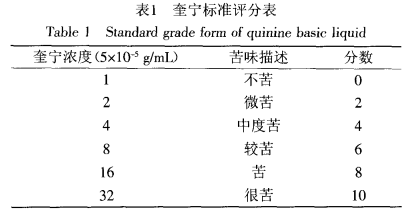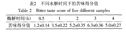 本文首先對大豆肽的苦味特性進行人工感官評價,然后冉研究電子舌儀器進行感官分析。本實驗從對苦味敏感的專業(yè)人員中選取10位感官評價員(5男5女)進行感官評價,每次品嘗之后,需要用清水漱口,再進行下一次品嘗。最后,將與其口味接近的奎寧標準液濃度對應(yīng)的分值記為此溶液的得分。之后取10位評價人員的平均分為苦味評定分數(shù)。以奎寧的作為評分標準,評分標準見表1。表2為風味蛋白酶不同水解時問下的苦味得分值。