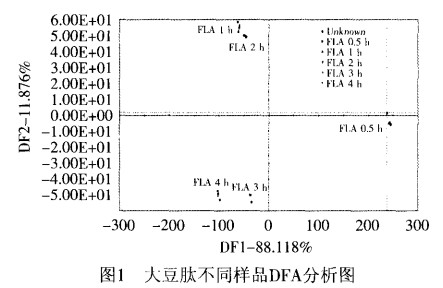 采用法國AlphaMOS電子舌對制取的五種不同酶解時間條件下的樣品進行苦味特性研究。分別采用DFA模式識別方法和PLS預測模型對采集的數(shù)據(jù)進行定性和定量分析,研究表明:采用DFA分析法能夠?qū)ξ宸N不同的大豆肽樣品的呈味特性和味覺相似程度進行定性評價,PLS模型能對未知樣品進行呈味預測;大豆肽的苦味預測結(jié)果與實際感官評價吻合。研究結(jié)果為后續(xù)大豆肽產(chǎn)品的呈味特性研究提供一種新的方法途徑。
