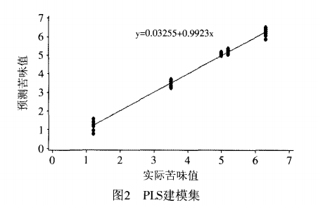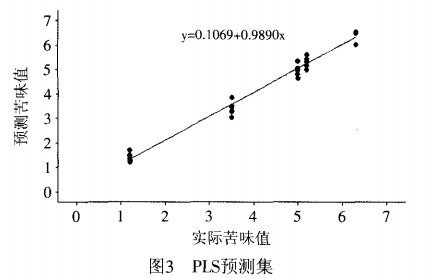 用PLS建立大豆肽溶液電子舌苦味預測模型,并對電子舌傳感器響應(yīng)值與人工感官評價得分值問的相關(guān)性進行研究。以七根傳感器的響應(yīng)信號值為白變量,以感官得分值為因變量構(gòu)建偏最小二乘模型。建模集為60個樣本,驗證集為30個樣本。結(jié)果如圖2、圖3所示,分別表示建模集、預測集的實際苦味值與預測值的相關(guān)圖。