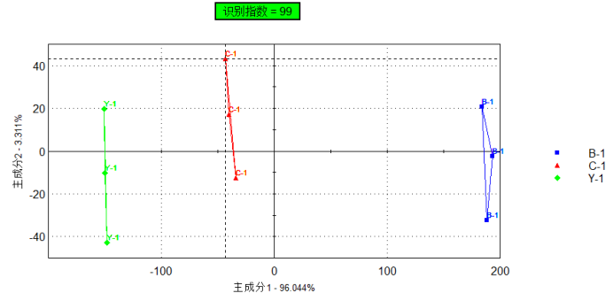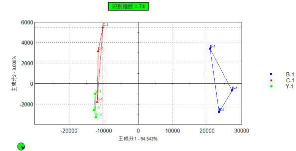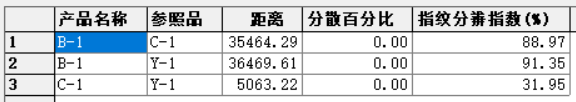 指紋分辨指數是根據主成分分析圖中的兩個樣品組間的相對距離計算得出,兩個樣品組間的距離越大,則兩個樣品組的指紋分辨指數越接近100%,即指紋分辨指數越大,樣品組間的區(qū)別越大。如表1所示,樣品B-1與Y-1間的指紋分辨指數較大,說樣品B-1與Y-1的差異較大,而樣品C-1與Y-1間的差異較小,即樣品C-1與Y-1間香氣更加接近。
