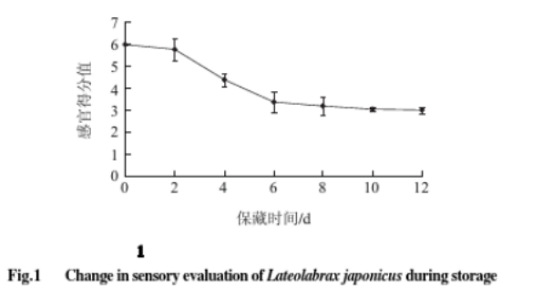 感官鮮度評(píng)價(jià):參考GB/T 18108-2019《鮮海水魚通則》標(biāo)準(zhǔn)。分別從眼球、鰓、魚體和肌肉4個(gè)方面制定鱸魚感官評(píng)分表,由5名具有評(píng)定經(jīng)驗(yàn)的感官評(píng)定人員,按鱸魚感官評(píng)定表分別對(duì)鱸魚的眼球、鰓、魚體和肌肉4個(gè)部位進(jìn)行感官評(píng)分,取4項(xiàng)評(píng)分的平均值作為綜合感官評(píng)分,6分表示極新鮮,3分表示貨架期的終點(diǎn),3分以下表示腐敗。