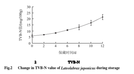 由上圖可知,保藏前4d TVB-N值上升比較緩慢,第4天開始上升加速,說明鱸魚品質(zhì)從第4天開始下滑較快;而由圖一感官得分的變化可知,從第2天開始鱸魚感官品質(zhì)明顯下降,說明在保藏初期鱸魚感官變化比TVB-N的變化更靈敏。第12天鱸魚的TVB-N值為21.6mg/100g,整個(gè)保藏過程中TVB-N值均為超過GB/T 18108-2008三級(jí)標(biāo)準(zhǔn)的要求(小于30mg/100g)。