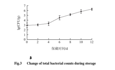 圖三表明,保藏出去菌落總數(shù)變化較小,出現(xiàn)明顯的延滯期,這是由于鱸魚中的微生物剛進(jìn)入冷環(huán)境,在0℃條件下生長緩慢。第6天菌落總數(shù)較第4天顯著增長,保藏后期總數(shù)繼續(xù)遞增,在貨架期終點(diǎn)時(shí)最大。菌落總數(shù)的變化趨勢(shì)與TVB-N值檢測(cè)結(jié)果基本一致。