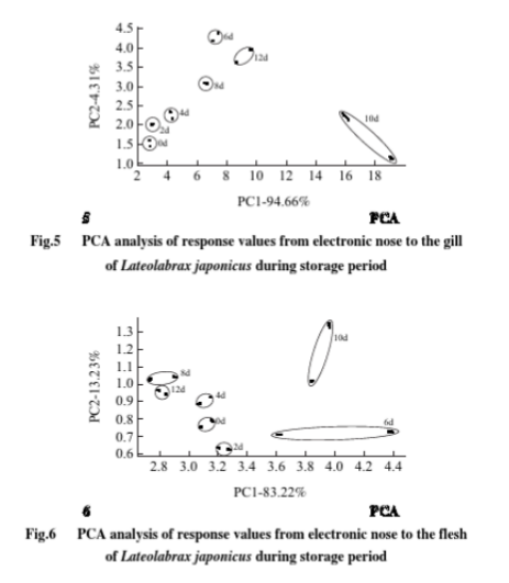 生鮮水產(chǎn)品在低溫保藏及流通過程中會(huì)受到溫度、微生物以及酶等因素的作用而導(dǎo)致品質(zhì)下降,并伴有揮發(fā)行氣味物質(zhì)的變化。本文用電子鼻檢測(cè)鱸魚魚鰓及魚肉的氣味變化,運(yùn)用主成分分析(PCA)、線性判別分析和負(fù)荷加載分析對(duì)數(shù)據(jù)進(jìn)行處理,并結(jié)合感官評(píng)定、揮發(fā)性鹽基氮和菌落總數(shù)進(jìn)行分析,為鱸魚新鮮度的快速檢測(cè)提供一種新的方法。