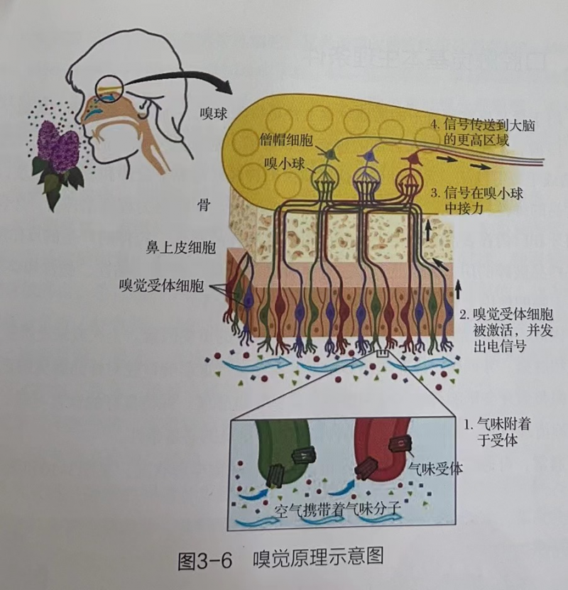 揮發(fā)性氣味物質(zhì)在呼吸作用下進入鼻腔,首先進入嗅感區(qū)吸附和溶解在嗅黏膜表面,與嗅腺細胞的分泌物溶在一起,進而擴散至嗅毛,被嗅細胞所感受,嗅細胞表面電荷改變,Na﹢,K﹢等離子跨膜移動產(chǎn)生電流發(fā)出電信號,通過傳導(dǎo)神經(jīng)以脈沖信號的形式傳遞,神經(jīng)末梢產(chǎn)生興奮信號,經(jīng)過大腦皮層嗅區(qū)信號處理分析后產(chǎn)生嗅覺(圖3-6)。