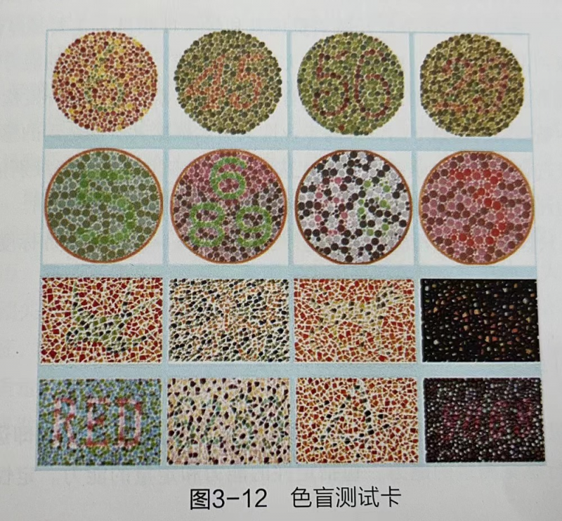 全色盲是色覺障礙中最嚴(yán)重的一種,患者喜暗、畏光,表現(xiàn)為晝盲。對于顏色只有明暗之分,而無顏色差別。紅色盲又稱第一色盲,患者主要是不能分辨紅色,對紅色與深綠色、藍色與紫紅色以及紫色不能分辨,常把綠色視為黃色,紫色看成藍色,將綠色和藍色相混視為白色。綠色盲又稱第二色盲,患者不能分辨淡綠色與深紅色、紫色與青藍色、紫紅色與灰色,把綠色視為灰色或暗黑色。臨床上把紅色盲與綠色盲統(tǒng)稱為紅綠色盲,該類患者比較常見。我們平常說的色盲一般就是指紅綠色盲。藍黃色盲又稱第三色盲。患者藍黃色混淆不清,對紅、綠色可辨。實踐中,主要采用色盲測試來初篩評價員的視覺條件,色盲測試采用如圖3-12所示的測試卡形式。
