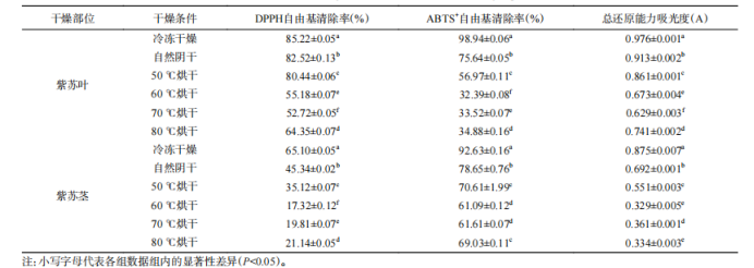 表4 不同干燥條件下紫蘇的抗氧化活性