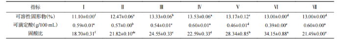 固酸比整體呈現(xiàn)先上升后下降的趨勢,在采收期Ⅵ達到最高值。
