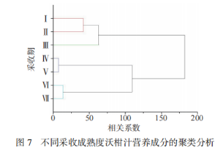 采用系統(tǒng)聚類分析方法對不同采收成熟度沃柑汁的營養(yǎng)成分進行R型聚類,聚類方法為組間聯(lián)接法,聚類區(qū)間為平方歐式距離,由圖7結(jié)果可知,采收期Ⅰ、Ⅱ沃柑汁歸為一類,采收期Ⅲ的沃柑汁歸為一類,采收期Ⅳ、Ⅴ沃柑汁歸為一類,采收期Ⅵ、Ⅶ沃柑汁歸為一類。綜合維生素C、總酚、氨基酸、類胡蘿卜素、檸檬苦素含量變化考慮,Ⅳ、Ⅴ采收期的沃柑營養(yǎng)成分含量均較高。