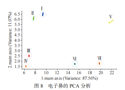 隨著果實成熟度的變化,不同采收期沃柑汁的電子鼻PCA分析結(jié)果如圖8所示。由圖可以看出,PCA分析圖橫坐標代表第一主成分(PC1),其貢獻率為87.56%,縱坐標代表第二主成分(PC2),其貢獻率為11.07%,前兩主成分的貢獻率累計為98.63%,能夠反映樣品的主要特征信息。同時PC1對區(qū)分不同采收期的沃柑汁起主要作用,基于電子鼻的分析結(jié)果發(fā)現(xiàn):不同采收期的沃柑汁可以很好區(qū)分,完全沒有重疊,說明隨著成熟度的變化,沃柑風味不同,另外采收期Ⅰ與Ⅱ、采收期Ⅲ與Ⅳ的距離較近,說明Ⅰ與Ⅱ、Ⅲ與Ⅳ采收期的沃柑果汁風味較接近。由此可見,不同采收成熟度的沃柑汁揮發(fā)性物質(zhì)不同,電子鼻可以準確識別出不同成熟度沃柑汁的特征氣味,并進行準確區(qū)分