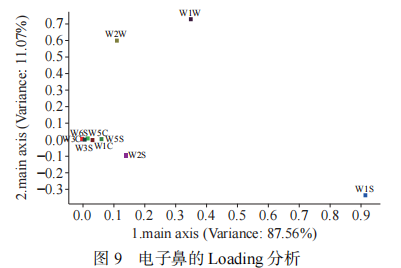 利用Loading分析可以區(qū)分當前模式下傳感器的相對重要性,若傳感器的響應值越偏離零,則該傳感器在識別中作用較強,即為識別傳感器,反之,如果響應值接近零,則該傳感器識別力可以忽略。由圖9電子鼻的Loading分析可以看出,PC1和PC2傳感器的貢獻率分別為87.56%、11.07%,總貢獻率為98.63%,在主成分1(PC1)貢獻率方面,傳感器W1S的貢獻率最大,其次是傳感器W1W;而在主成分2(PC2)貢獻率方面,傳感器W1W的貢獻率最大,其次是傳感器W2W。說明第一主成分主要反映的是對甲基類,其次是無機硫化物,第二主成分主要反映的是無機硫化合物,其次是芳香成分、有機硫化合物。