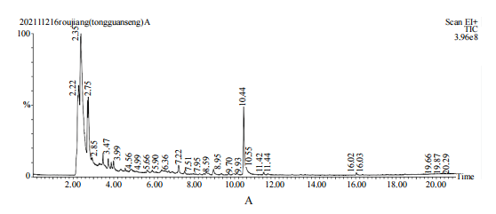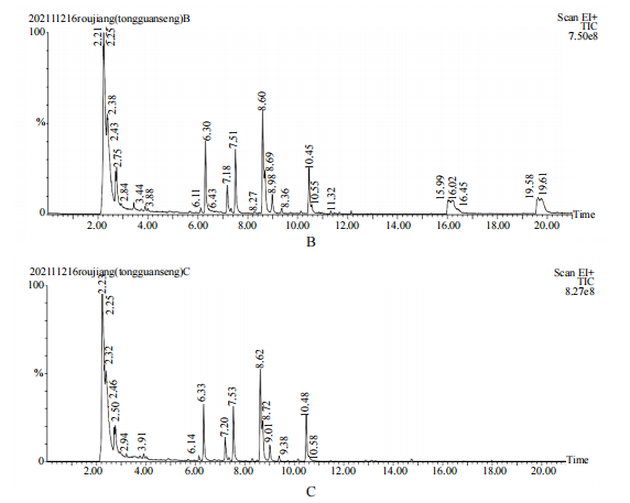 GC-MS檢測添加鮮花椒芽及油酥花椒芽使產(chǎn)品的風味發(fā)生了明顯的變化,對產(chǎn)品進行GC-MS檢測,樣品的總離子流圖見圖4。從圖4中可以看出A、C樣品的出峰時間主要集中在2~11min之間;B樣品的出峰時間集中在2~20min之間。從出峰時間可以看出,A、C與B樣品是有差異的。