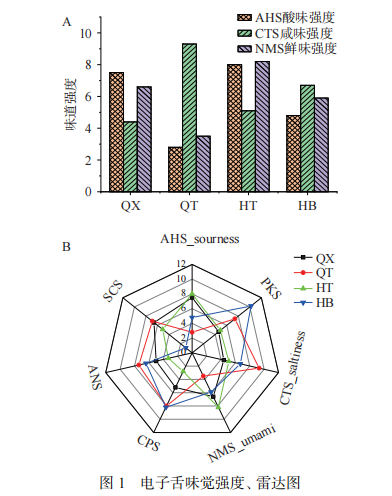 圖1A是電子舌味覺信號強(qiáng)度圖,可見酸味強(qiáng)度值(AHS):HT>QX>HB>QT,且樣品HT與樣品QT酸味強(qiáng)度值相差5.2,差異顯著;咸味強(qiáng)度值(CTS):QT>HB>HT>QX,且樣品QT與樣品QX咸味強(qiáng)度值相差4.9,差異明顯;鮮味強(qiáng)度值(NMS):HT>QX>HB>QT,且樣品HT與樣品QT鮮味強(qiáng)度值相差4.7,差異明顯。電子舌味覺信號強(qiáng)度差異表明牦牛肉不同部位滋味差異明顯。