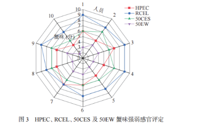 香氣感官評定 隨機(jī)選擇10名經(jīng)過感官評定培訓(xùn)的人員,對制備的HPEC、RCEL、50CES和50EW蟹味強(qiáng)弱進(jìn)行評定,蟹味濃,取7~10分;蟹味稍濃,取4~7分;蟹味較淡,取0~4分。
