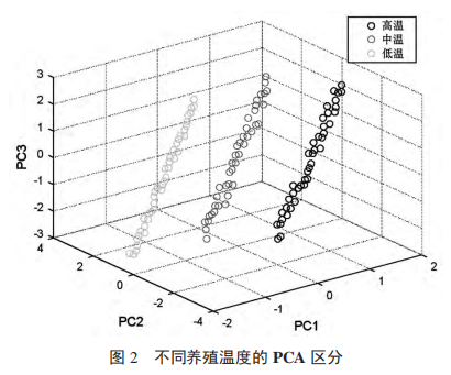 將不同養(yǎng)殖溫度條件的養(yǎng)殖水樣品,使用電子舌進(jìn)行檢測(cè)并進(jìn)行主成分分析,由圖 2 可得,主成分分析前 3 個(gè)主要成分貢獻(xiàn)率為 98.7%,其中 PC1 和 PC2的表達(dá)占據(jù)大部分信息。從區(qū)分效果來(lái)看,3 種養(yǎng)殖溫度可被明顯分析出,且同一養(yǎng)殖溫度的樣品呈現(xiàn)明顯的聚集特性。