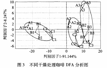 電 子 舌 能 夠 較 好 的 區(qū) 分 不 同 干 燥 處 理 方 式 的 咖 啡 ,主 成 分 1的 貢 獻(xiàn) 率 及 判 別 因 子 1的 貢 獻(xiàn) 率 , 均 達(dá) 到 90% 以 上 ,PCA 分 析 與 DFA 分 析 證 明 結(jié) 論 一致 ,說 明 兩 種 分 析 方 式 對(duì) 咖 啡 樣 品 均 具 有 良 好 的 區(qū)分 。