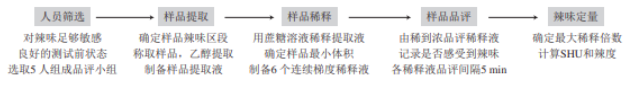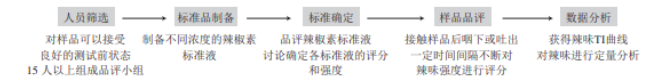 時間-強(qiáng)度( time-intensity,TI)法是一種用于評價樣品辣味隨時間變化的感官評價手段,是經(jīng)典感官評分方法的延伸,這種方法常利用不同濃度的辣椒素標(biāo)準(zhǔn)品使參評人員建立相對統(tǒng)一的感官評價標(biāo)準(zhǔn),并要求品評員在攝入樣品后的一段時間內(nèi)持續(xù)地對辣味的強(qiáng)弱進(jìn)行打分。TI法的基本操作流程如下所示。