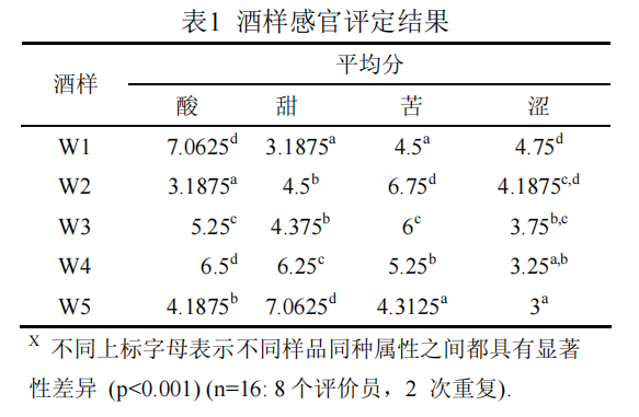 對(duì)五種櫻桃酒的感官屬性(酸、甜、苦、澀)進(jìn)行感官評(píng)定,結(jié)果如表 1 所示。由表 1 可知,W1 的酸味和澀感最強(qiáng),但甜味值最低。W2 的苦味值最大,酸味值最小。W5 甜味值最大,而澀值最小。相比較而言,W3 和 W4 的味覺(jué)和口感強(qiáng)度均處于中等強(qiáng)度。