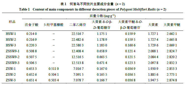 2.2.2 對(duì)照品溶液的制備 精密稱(chēng)定沒(méi)食子酸、5-羥甲基糠醛、二苯乙烯苷、大黃素-8-O-β-D-葡萄糖苷、大黃素甲醚-8-O-β-D-葡萄糖苷、大黃素、大黃素甲醚對(duì)照品各適量,分別加80%甲醇制成質(zhì)量濃度分別為57.6、68.4、625.0、50.2、8.6、180.0、0.216 μg/mL的對(duì)照品溶液,即得。 2.2.3 供試品溶液的制備 取何首烏飲片粉末(過(guò)40目篩)約1 g,精密稱(chēng)定,置平底燒瓶中,精密加入80%甲醇25 mL,密塞,稱(chēng)定質(zhì)量,加熱回流提取30 min,放冷,密塞,再稱(chēng)定質(zhì)量,用80%甲醇補(bǔ)足減失的質(zhì)量,搖勻,經(jīng)微孔濾膜(0.45 μm)濾過(guò),即得。 2.2.4 線(xiàn)性關(guān)系考察 分別精密吸取對(duì)照品溶液1、5、10、15、20、25 μL,注入液相色譜儀,按“2.2.1”項(xiàng)下色譜條件測(cè)定,以對(duì)照品質(zhì)量濃度為橫坐標(biāo)(X),峰面積為縱坐標(biāo)(Y)繪制標(biāo)準(zhǔn)曲線(xiàn),并計(jì)算得到回歸方程與線(xiàn)性范圍,結(jié)果分別為沒(méi)食子酸Y=28 655.693 5 X-3 449.895 2,R2=1.000 0,線(xiàn)性范圍5.76~144.00 mg/L;5-羥甲基糠醛Y=78 294.955 3 X+11 679.404 8,R2=1.000 0,線(xiàn)性范圍6.84~171.00 mg/L;二苯乙烯苷Y=16 640.258 1 X+12 599.471 0,R2=0.999 9,線(xiàn)性范圍62.50~1 562.50 mg/L;大黃素-8-O-β-D-葡萄糖苷Y=30 743.247 5 X-9 558.630 6,R2=0.999 9,線(xiàn)性范圍5.02~125.50 mg/L;大黃素甲醚-8-O-β-D-葡萄糖苷Y=27 693.578 4 X-241.880 6,R2=1.000 0,線(xiàn)性范圍0.86~21.50 mg/L;大黃素Y=34 965.433 1 X-22 341.082 3,R2=0.999 9,線(xiàn)性范圍18.00~450.00 mg/L;大黃素甲醚Y=37 991.286 3 X+8 456.727 4,R2=1.000 0,線(xiàn)性范圍21.60~540.00 mg/L;結(jié)果表明,各對(duì)照品在各自范圍內(nèi)線(xiàn)性關(guān)系良好。 2.2.5 精密度試驗(yàn) 精密吸取供試品溶液(ZSW-1)10 μL,重復(fù)進(jìn)樣6次,按“2.2.1”項(xiàng)下色譜條件測(cè)定,6次測(cè)定結(jié)果顯示,沒(méi)食子酸、5-羥甲基糠醛、二苯乙烯苷、大黃素-8-O-β-D-葡萄糖苷、大黃素甲醚-8-O-β-D-葡萄糖苷、大黃素、大黃素甲醚峰面積的RSD分別為0.17%、0.39%、0.31%、0.54%、1.64%、0.21%、0.63%,表明儀器精密度良好。 2.2.6 穩(wěn)定性試驗(yàn) 精密吸取供試品溶液(ZSW-1)10 μL,分別于制備后0、2、4、8、12、24 h進(jìn)樣共6次,按“2.2.1”項(xiàng)下色譜條件測(cè)定,結(jié)果沒(méi)食子酸、5-羥甲基糠醛、二苯乙烯苷、大黃素-8-O-β-D-葡萄糖苷、大黃素甲醚-8-O-β-D-葡萄糖苷、大黃素、大黃素甲醚峰面積的RSD分別為0.52%、0.82%、0.36%、1.38%、1.54%、0.39%、0.90%,表明供試品溶液在24 h內(nèi)保持穩(wěn)定。 2.2.7 重復(fù)性試驗(yàn) 取制何首烏粉末(ZSW-1)約1 g,精密稱(chēng)定,共6份,按“2.2.3”項(xiàng)下方法制備供試品溶液,分別精密吸取10 μL,注入液相色譜儀,按“2.2.1”項(xiàng)下色譜條件測(cè)定,記錄峰面積并計(jì)算各成分含量,結(jié)果沒(méi)食子酸、5-羥甲基糠醛、二苯乙烯苷、大黃素-8-O-β-D-葡萄糖苷、大黃素甲醚-8-O-β-D-葡萄糖苷、大黃素、大黃素甲醚含量的RSD分別為0.33%、0.92%、0.08%、1.65%、1.67%、1.59%、1.90%,表明該方法重復(fù)性良好。 2.2.8 加樣回收率試驗(yàn) 精密稱(chēng)定已測(cè)定指標(biāo)成分含量的何首烏粉末(ZSW-1)約0.5 g,共6份,置平底燒瓶中,分別加入對(duì)照品適量,按“2.2.3”項(xiàng)下方法制備供試品溶液。精密吸取上述樣品與對(duì)照品溶液各10 μL,注入液相色譜儀,按“2.2.1”項(xiàng)下色譜條件進(jìn)行測(cè)定,記錄峰面積并計(jì)算加樣回收率,沒(méi)食子酸、5-羥甲基糠醛、二苯乙烯苷、大黃素-8-O-β-D-葡萄糖苷、大黃素甲醚-8-O-β-D-葡萄糖苷、大黃素、大黃素甲醚的平均加樣回收率分別為98.88%、97.99%、97.32%、102.85%、108.12%、96.67%、99.33%,RSD分別為0.36%、0.74%、0.33%、0.74%、0.93%、0.43%、1.16%,均符合《中國(guó)藥典》2020年版規(guī)定標(biāo)準(zhǔn)。 2.2.9 樣品測(cè)定 分別稱(chēng)取生何首烏、九蒸九曬何首烏、藥典法制何首烏飲片適量,按“2.2.3”項(xiàng)下方法制備供試品溶液,每個(gè)樣品平行2次,按“2.2.1”項(xiàng)下色譜條件進(jìn)行測(cè)定,記錄峰面積并計(jì)算各成分含量,結(jié)果見(jiàn)表1。含量測(cè)定結(jié)果表明,何首烏不同飲片中均含有沒(méi)食子酸、二苯乙烯苷、大黃素-8-O-β-D-葡萄糖苷、大黃素甲醚-8-O-β-D-葡萄糖苷、大黃素、大黃素甲醚6種成分,但不同飲片間各成分含量存在一定差異。九蒸九曬、藥典法制何首烏中沒(méi)食子酸及蒽醌苷元類(lèi)成分的含量與生何首烏相比,均有不同程度的增加,其中以沒(méi)食子酸含量增加最為顯著,藥典法制何首烏約為生品的3倍,九蒸九曬何首烏約為生品的2倍。炮制為制何首烏后,苷類(lèi)(二苯乙烯苷、蒽醌苷)成分含量顯著減少,與生何首烏相比,九蒸九曬何首烏中二苯乙烯苷含量減少了約44%,蒽醌苷類(lèi)成分含量減少了約41%;藥典法制何首烏中二苯乙烯苷含量減少了約69%,蒽醌苷類(lèi)成分含量減少了約85%;而5-羥甲基糠醛僅在藥典法制何首烏飲片中檢出,平均質(zhì)量分?jǐn)?shù)為0.506 1 mg/g。