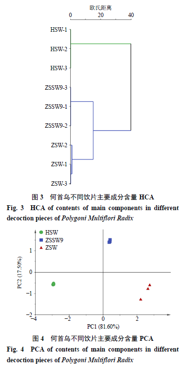 2.4 數(shù)據(jù)分析 2.4.1 含量測(cè)定數(shù)據(jù)分析 將何首烏不同飲片主要成分含量數(shù)據(jù)導(dǎo)入SIMCA 14.1進(jìn)行系統(tǒng)聚類(lèi)分析(hierarchical cluster analysis,HCA)與無(wú)監(jiān)督的主成分分析(principal component analysis,PCA),觀(guān)察何首烏不同飲片間聚類(lèi)與自然聚集,結(jié)果見(jiàn)圖3、4。HCA結(jié)果顯示,何首烏不同飲片可各自聚類(lèi),當(dāng)分類(lèi)距離大于15時(shí),3種飲片聚為2類(lèi),生何首烏聚為一類(lèi),九蒸九曬何首烏與藥典法制何首烏聚為一類(lèi)。PCA結(jié)果顯示,PC1和PC2的貢獻(xiàn)率分別為81.60%和17.50%,累積貢獻(xiàn)率達(dá)99.10%,說(shuō)明該數(shù)據(jù)能較好反應(yīng)何首烏不同飲片的整體信息。何首烏不同飲片各自聚集,可分為3類(lèi),生何首烏集中分布在III象限,九蒸九曬何首烏集中分布在I象限,藥典法制何首烏集中分布在IV象限。