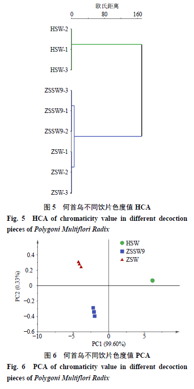 3 討論 本實(shí)驗(yàn)分別采用50%、80%、100%甲醇及50%、80%、100%乙醇作為提取溶劑考察對(duì)各成分含量的影響,結(jié)果表明以80%甲醇提取各成分含量較高且峰形良好,因此選用80%甲醇作為提取溶劑;分別比較了超聲15、30、45、60 min,回流30、60、90、120 min,冷浸4、8、12 h對(duì)各成分含量的影響,結(jié)果表明回流對(duì)各成分的提取率較高,且不同回流時(shí)間下提取率差異不大,因此選用回流30 min作為提取方法。通過(guò)對(duì)提取方法的考察,最終確定本實(shí)驗(yàn)供試品溶液的制備方法為80%甲醇回流提取30 min。本實(shí)驗(yàn)通過(guò)對(duì)古代經(jīng)典九蒸九曬炮制法與藥典法制何首烏飲片的對(duì)比研究,發(fā)現(xiàn)二者主要成分含量及顏色的總體變化趨勢(shì)較為相似,但有程度上的差異,且二者成分組成也有明顯的區(qū)別。 何首烏中含有鞣質(zhì)類(lèi)成分和具有沒(méi)食子酰基的苷類(lèi)成分[20-21],在炮制過(guò)程中上述成分受熱分解后轉(zhuǎn)化為沒(méi)食子酸[22-23],故炮制后沒(méi)食子酸量顯著增加。二苯乙烯和蒽醌類(lèi)成分是何首烏中的主要有效成分,同時(shí)也是其肝毒性的主要物質(zhì)基礎(chǔ)[24-25],二者的含量及結(jié)構(gòu)與何首烏肝損傷的發(fā)生密切相關(guān),可通過(guò)控制合理的炮制工藝,將上述2類(lèi)成分的含量控制在安全有效的范圍內(nèi),以便提高用藥的安全性[26]。二苯乙烯及蒽醌類(lèi)成分對(duì)光、熱具有不穩(wěn)定性[27-28],在加熱炮制過(guò)程中會(huì)發(fā)生分解,在反復(fù)蒸、曬過(guò)程中會(huì)發(fā)生光環(huán)加成反應(yīng)[29],因此,采用連續(xù)加熱方式的藥典法制何首烏比采用間隔蒸、曬方式的九蒸九曬何首烏中上述2類(lèi)成分含量降低的幅度更為顯著。 5-羥甲基糠醛既是Maillard反應(yīng)產(chǎn)物,又可通過(guò)糖的直接降解或脫水產(chǎn)生[30-31],溫度的升高和加熱時(shí)間的延長(zhǎng)均可導(dǎo)致其含量增加[32],因此5-羥甲基糠醛成為很多采用加熱炮制(炒制、蒸制、燉制等)中藥飲片的特征性標(biāo)志物。何首烏中含有的糖類(lèi)成分以及炮制過(guò)程中苷類(lèi)分解產(chǎn)生的糖類(lèi)成分均可與氨基成分發(fā)生Maillard反應(yīng),從而生成5-羥甲基糠醛。本實(shí)驗(yàn)中僅在藥典法制何首烏飲片中檢測(cè)到了5-羥甲基糠醛,而九蒸九曬何首烏飲片中未檢出該成分,說(shuō)明5-羥甲基糠醛的產(chǎn)生與炮制工藝密切相關(guān)。藥典法采用液體輔料連續(xù)燉制,而九蒸九曬法采用固體輔料間隔蒸、曬,何首烏飲片在兩種方法炮制過(guò)程中的受熱程度、加熱方式、加熱時(shí)間及光照等都有著顯著差異,且5-羥甲基糠醛性質(zhì)活潑,對(duì)溫度、濕度、光、空氣較為敏感[33],可進(jìn)一步分解為乙酰丙酸和甲酸或是聚合[34],推測(cè)在九蒸九曬何首烏中由于“曬”這一工藝環(huán)節(jié),導(dǎo)致已生成的5-羥甲基糠醛分解,因此未能檢出。 5-羥甲基糠醛具有抗心肌缺血、抗氧化等作用,同時(shí),該成分還易導(dǎo)致結(jié)腸小囊異常生長(zhǎng)(aberrant crypt foci,ACF),對(duì)人體橫紋肌和內(nèi)臟也具有毒副作用[34]。此外,不同炮制方法對(duì)何首烏飲片中主要成分的量比關(guān)系也有顯著的影響,九蒸九曬制何首烏中各類(lèi)成分的量比關(guān)系約為沒(méi)食子酸-二苯乙烯苷-蒽醌苷-蒽醌苷元(1∶25∶2∶10),而藥典法制何首烏中上述成分的量比關(guān)系約為1∶11∶0.3∶7,各成分間量比關(guān)系差異顯著,因此,古今2種方法制備的何首烏飲片主要藥效物質(zhì)組成及量比關(guān)系的顯著差異極有可能會(huì)成為導(dǎo)致其藥效及毒性差異的主要原因,后續(xù)將通過(guò)相關(guān)藥效學(xué)實(shí)驗(yàn)進(jìn)行系統(tǒng)的研究。 電子眼測(cè)定結(jié)果表明,不同炮制方法對(duì)何首烏飲片顏色的影響也不盡相同。顏色的變化主要源于2個(gè)方面,一方面是何首烏在炮制過(guò)程中自身化學(xué)成分在高溫、高濕的條件下發(fā)生褐變反應(yīng),生成褐色聚合物,導(dǎo)致飲片顏色加深;另一方面是源于炮制過(guò)程中輔料的間接影響,藥典法應(yīng)用的液體輔料黑豆汁中含有大量色素類(lèi)成分[35],對(duì)何首烏飲片起賦色作用,導(dǎo)致其飲片顏色加深,而九蒸九曬方法中應(yīng)用的是固體輔料黑豆,對(duì)何首烏飲片幾乎無(wú)賦色作用,由此形成了兩種方法炮制的何首烏飲片顏色上的差異。 為了進(jìn)一步分析何首烏飲片物質(zhì)基礎(chǔ)與顏色的相關(guān)性,本實(shí)驗(yàn)對(duì)測(cè)定的7種主要化學(xué)成分含量與顏色特征值進(jìn)行了多元統(tǒng)計(jì)分析,HCA和PCA結(jié)果顯示古今方法炮制的何首烏飲片可各自聚為一類(lèi),且與生何首烏相比,古、今方法炮制的何首烏飲片可聚為一類(lèi),進(jìn)一步驗(yàn)證了九蒸九曬法與藥典法制何首烏飲片的個(gè)性特征及共性規(guī)律。沒(méi)食子酸及蒽醌苷元含量與何首烏飲片顏色變深呈正相關(guān),二苯乙烯苷及蒽醌苷含量與何首烏飲片顏色變深呈負(fù)相關(guān)。因此,可通過(guò)快速無(wú)損的顏色檢測(cè),實(shí)現(xiàn)對(duì)何首烏飲片炮制工藝的控制及飲片質(zhì)量的客觀(guān)評(píng)價(jià)。本實(shí)驗(yàn)從物質(zhì)基礎(chǔ)與顏色變化的相關(guān)性