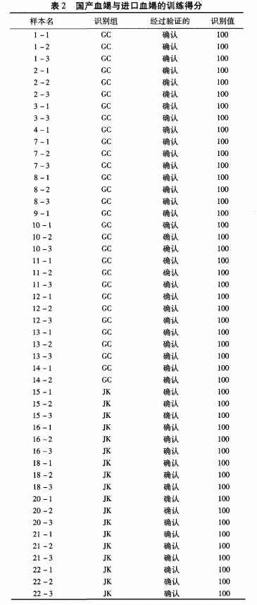 如圖 1所示 ,電子鼻將國產(chǎn)血竭樣品與進(jìn)口血竭樣品分成了兩個(gè)區(qū)域 ,紅色區(qū)域?yàn)閲a(chǎn)血竭 ,兩種不同的血竭樣品的差別主要表現(xiàn)在判別因子 1(100),進(jìn)口血竭落在了Y軸的左側(cè) ,國產(chǎn)血竭落在了Y軸的右側(cè)。訓(xùn)練得分表明所用樣品均經(jīng)過確認(rèn) ,且識(shí)別值均為 100分 。由 DFA判別模型可基本知曉國產(chǎn)血竭和進(jìn)口血竭在氣味上有著一定的區(qū)別 。訓(xùn)練得分如表 2所示。