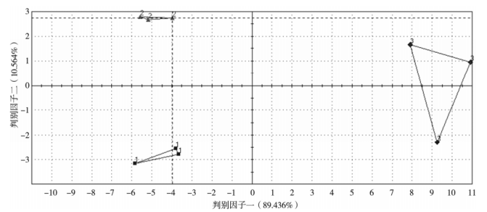 圖2 不同發(fā)酵方式柿子酒的主成分分析三維圖 電子鼻對不同發(fā)酵方式柿子酒進行判別因子分析 由圖3可知,第一區(qū)分指數(shù)達到89.44%,第二區(qū)分指數(shù)達到10.56%,二者累計區(qū)分指數(shù)合計達到100%,說明判別因子分析能夠更好地顯示3種發(fā)酵方式柿子酒間的差異。從圖3還可以看出,皮渣發(fā)酵和清汁發(fā)酵的香氣成分差異較小,果漿發(fā)酵與皮渣發(fā)酵和清汁發(fā)酵樣品間的香氣成分差異較大。
