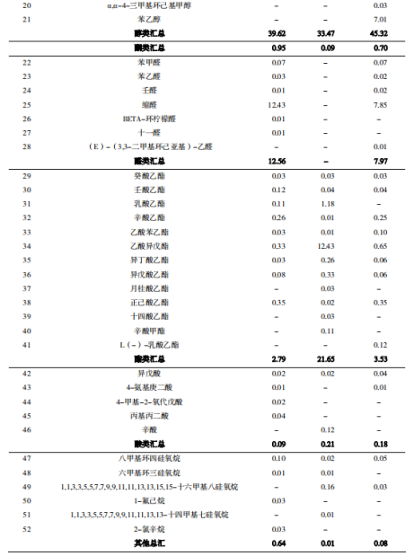 由表5表明,因子載荷量>0.950的物質共有89種,在第一主成分中有48種,其中有35種在清汁發(fā)酵的樣品中檢測出,有25種在皮渣發(fā)酵的樣品中檢測出,有23種在果漿發(fā)酵的樣品中檢測出。第二主成分中有30種,其中有26種在皮渣發(fā)酵的樣品中檢測出,有6種在清汁發(fā)酵的樣品中檢測出,有6種在果漿發(fā)酵的樣品中檢測出。 表5 成分矩陣