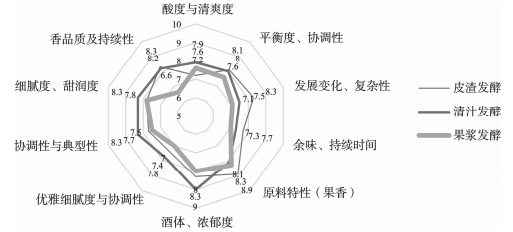 圖4 柿子酒中香氣物質分類 不同發(fā)酵方式柿子酒的感官分析 由圖5可知,根據柿子果酒感官評分標準,對3種發(fā)酵方式柿子酒進行感官評價。研究發(fā)現(xiàn),清汁發(fā)酵柿子酒香氣得分與皮渣發(fā)酵比較接近,在柿子壓榨過程中香氣成分有所損失,與電子鼻檢測結果相同。清汁發(fā)酵柿子酒綜合感官評分大于果漿發(fā)酵和皮渣發(fā)酵柿子酒,與氣相-質譜檢測到清汁發(fā)酵柿子酒香氣成分較多的結果相同。