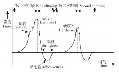 質(zhì)地剖面分析測試原理是模擬人體口腔咀嚼運動,通過對樣品2次擠壓進行測定。質(zhì)地剖面分析曲線見圖1。咀嚼性為硬度、凝聚力和彈性3個參數(shù)值的乘積,常作為質(zhì)地結(jié)構(gòu)綜合指標。