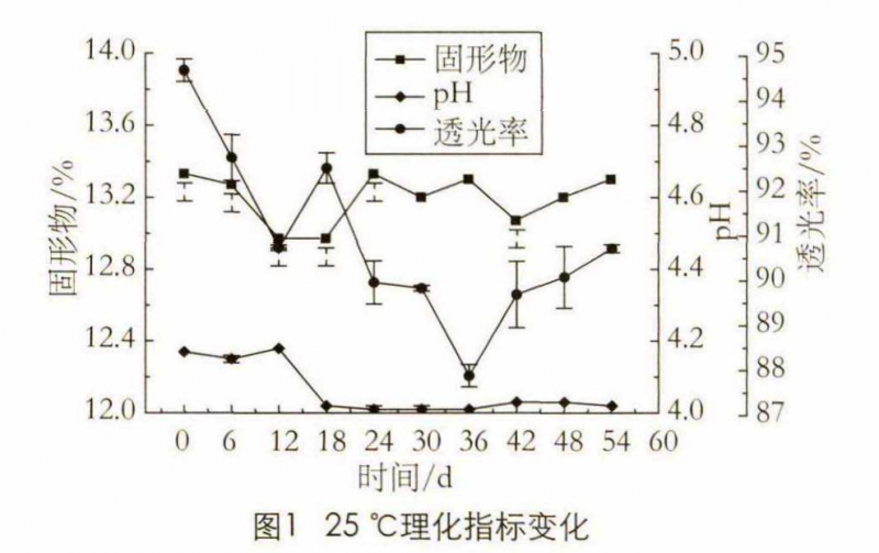 由圖1可知:25 °C下隨著儲(chǔ)藏時(shí)間的延長(zhǎng),可溶性固形物含量維持在12.87%? 13.23%,整體趨勢(shì)變化幅度不大。pH在第 18天降低為3.56,過(guò)低的pH會(huì)影響格瓦斯的風(fēng)味與口感。隨著儲(chǔ)藏時(shí)間不斷延長(zhǎng),透光率從初始94.68%出現(xiàn)明顯下降,第 18天為9 2 . 5 2 % ,第24天降低為90.07%。根據(jù)實(shí)驗(yàn)可知,當(dāng)透光率降到% %以下時(shí),飲料色澤會(huì)變差、出現(xiàn)細(xì)小渾濁,因此設(shè)定透光率低于90 % 的儲(chǔ)藏時(shí)間為貨架期終點(diǎn)。目卩25 °C時(shí)青稞格瓦斯貨架期為24 d。
