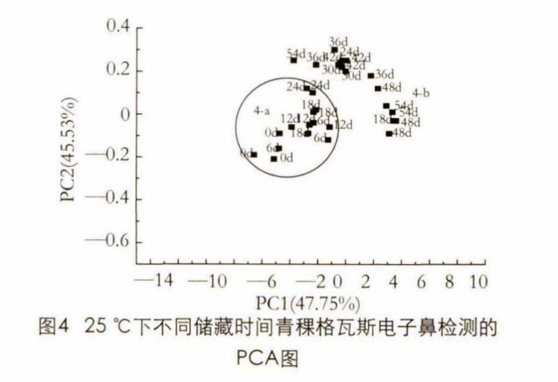 由圖4 可知:在 25 °C時(shí) ,第一、二主成分的貢獻(xiàn)度分別為 47.75 % 、45.53 % , 總貢獻(xiàn)率達(dá)93.28%。一般坐標(biāo)軸上貢獻(xiàn)率之和大于85 % , 便可以較好地反映整體的信息,即兩主成分包含了樣品的大部分信息。隨著儲(chǔ)藏時(shí)間的延長(zhǎng),樣品沿PC1軸向右,PC2軸先向下后向上,再向下分布。樣品儲(chǔ)藏在前24 d內(nèi),由于風(fēng)味未發(fā)生較大變化,所以在PCA圖上各點(diǎn)分布較為集中;當(dāng)樣品儲(chǔ)藏時(shí)間超過(guò)24 d,由于揮發(fā)性風(fēng)味發(fā)生較大變化,各點(diǎn)分布與儲(chǔ)藏24 d前形成的區(qū)域距離較遠(yuǎn) 。所 以 ,從風(fēng)味的角度可以反映出儲(chǔ)藏于 25 °C下,青稞格瓦斯在24 d左右風(fēng)味便發(fā)生較大變化,貨架期為24 d, 最優(yōu)為18 d。