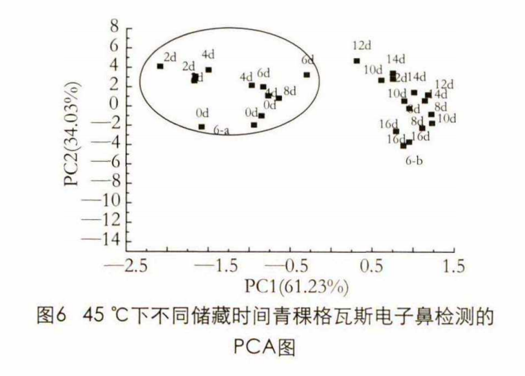 由圖6可知:在45 °C時(shí) ,第一、二主成分的貢獻(xiàn)度分別為 61.32 % 、34.03 % , 總貢獻(xiàn)率達(dá)95.35 % ,說(shuō)明主成分可以將原始髙維矩陣數(shù)據(jù)的信息較好地反映出來(lái)。樣品在6 d前各點(diǎn)分布集中,風(fēng)味無(wú)明顯變化;6 d后各點(diǎn)在PCA圖譜上的分布與區(qū)域6-a距離較遠(yuǎn),風(fēng)味發(fā)生顯著變化。從風(fēng)味變化的角度分析,青稞格瓦斯儲(chǔ)藏在45 °C下貨架期為6 d。