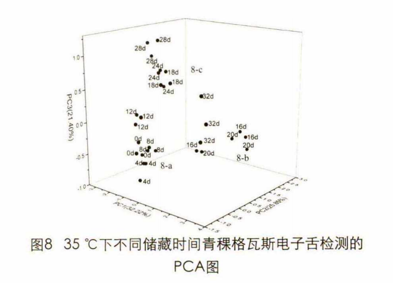 由圖8可知:當(dāng)儲(chǔ)藏溫度為35 °C時(shí) ,第一、二、三主成分的貢獻(xiàn)度分別為32.22%、25.85%、21.40%,總貢獻(xiàn)率達(dá)79.47%,基本上解釋了樣品的大部分信息。在三維圖譜上可以看出,隨著儲(chǔ)藏時(shí)間的延長(zhǎng),樣品延PC1、PC2構(gòu)成的底面從左至右開(kāi)始分布,延PC3軸先向下后向上開(kāi)始分布。在儲(chǔ)藏時(shí)間32 d內(nèi),隨著滋味的變化樣品在PCA三維圖譜上形成了3個(gè)分布界限較為明顯的區(qū)域 ,8-a、8-b、8-c , 儲(chǔ)藏時(shí)間分界線(xiàn)分別是 12 d、16?20 d、 18 ? 24 d。