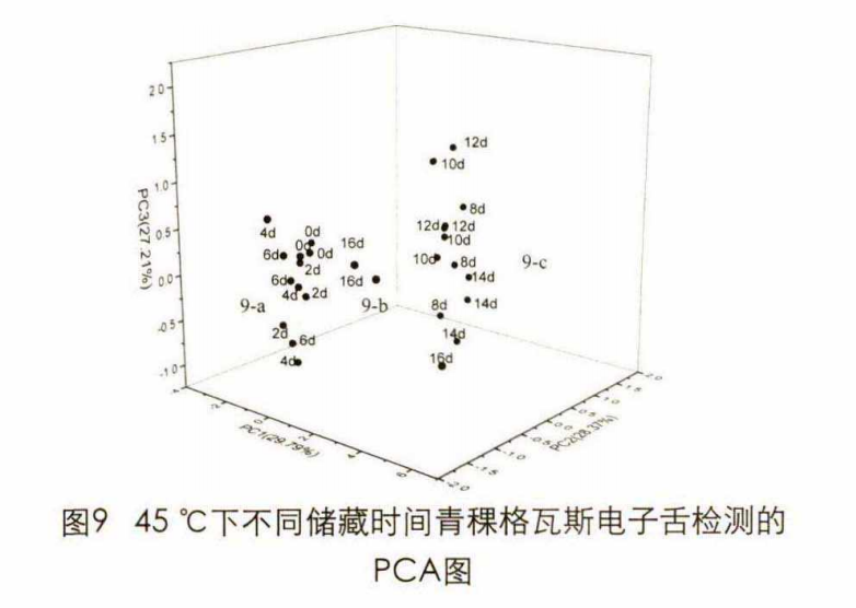 由圖9可知:在溫度為 45°C時(shí) ,第 一 、二 、三 主 成 分 的 貢獻(xiàn)度分別為 29.79 % 、28.37 % 、27.21 % ,總貢獻(xiàn)率達(dá)85.37%, PCA三維圖譜基本上反映樣品的大部分信息。由圖9可知,樣品基本上延PC3軸向上分布,形成9-a、9-b、9-c 3個(gè)分界明顯的區(qū)域。6 d前各點(diǎn)分布緊密,形成區(qū)域9-a;6 d后隨著儲(chǔ)藏時(shí)間的延長(zhǎng)樣品在PCA三維圖譜上的分布較區(qū)域9-a較遠(yuǎn),且各自分布松散,可能是由于儲(chǔ)藏時(shí)間較長(zhǎng),導(dǎo)致滋味呈無(wú)規(guī)律變化。從滋味角度可以反映出儲(chǔ)藏于45 °C ,青稞格瓦斯的貨架期為6 d。