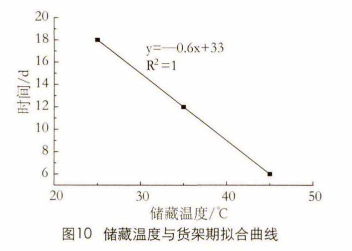 Q10值為溫度相差10 °C時(shí)食品的貨架期之比,該值用來(lái)確定溫度對(duì)反應(yīng)的敏感程度,大多數(shù)據(jù)為2。由表1可知,3種溫度下青棵格瓦斯的貨架期數(shù)據(jù),計(jì)算得Q10為 1.5?2.0,平均值為 1.75。應(yīng)用Origin軟件對(duì)貨架期Y和溫度X的關(guān)系進(jìn)行曲線(xiàn)擬合,發(fā)現(xiàn)Y與X的關(guān)系最符合一次函數(shù),擬合方程為Y=-0.6X+33, R2=1。為驗(yàn)證模型的準(zhǔn)確性 ,實(shí)驗(yàn)選取28、38 °C儲(chǔ)藏,所得格瓦斯的貨架期分別為 18、10 d, 模型預(yù)測(cè)值為16.2、10.2 d,預(yù)測(cè)值的相對(duì)誤差率在-1 0 %?2 % , 誤差較小,說(shuō)明此模型可快速地對(duì)青棵格瓦斯貨架期進(jìn)項(xiàng)初步預(yù)測(cè)。
