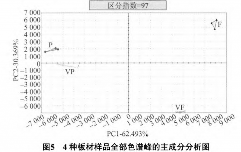 為減少試驗(yàn)過程中的誤差,選取試驗(yàn)中的3組數(shù)據(jù)進(jìn)行分析。根據(jù)試驗(yàn)方法,選擇試驗(yàn)結(jié)果中的全部色譜峰進(jìn)行PCA分析,得到圖5。當(dāng)區(qū)分指數(shù)(Discrimination index)>80時(shí)就可以認(rèn)為二者區(qū)分度較好,且數(shù)值越接近100區(qū)分度越高。由圖5可知,主成分1(PC 1)即橫坐標(biāo)對(duì)4種板材的區(qū)分度為62.493%,主成分2(PC 2)縱坐標(biāo)的區(qū)分度為30.369%。電子鼻將所有的區(qū)別因素化繁為簡(jiǎn),綜合提取了兩種區(qū)分因素即PPC l和PC 2便可將4種板材樣品區(qū)別開來。4種板材的區(qū)分指數(shù)為97,這說明Heracles II能夠很好地區(qū)分不同的人造板材樣品。