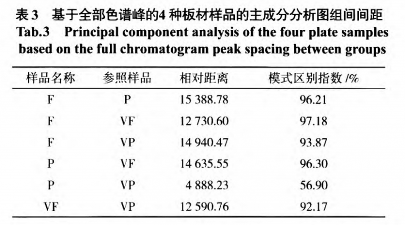 通過4種樣品的相對(duì)位置大致了解樣品的區(qū)別,橫縱坐標(biāo)的數(shù)值只是相對(duì)位置。在4種板材樣品中,刨花板與貼面刨花板距離較近且明顯遠(yuǎn)離其他兩種樣品,說明刨花板與貼面刨花板之問樣品差異較小,氣味較為接近,即刨花板貼面與否與氣味差別的大小關(guān)系相對(duì)較低。而對(duì)于纖維板和貼面纖維板樣品來說,二者相對(duì)距離較遠(yuǎn),不僅在種類上明顯區(qū)別于刨花板和貼面刨花板,而且可以看出是否貼面對(duì)于纖維板板材成品氣味的影響較大。