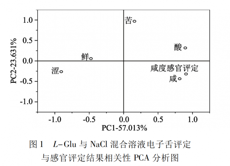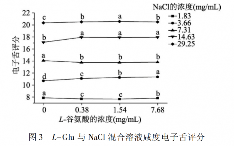 低濃度氯化鈉水平下,谷氨酸對其咸度有抑制效果,但在 3.66 mg /mL 氯化鈉水平下,谷氨酸對其咸度卻有增強作用,而在高濃度氯化鈉水平下,谷氨酸對其咸度有增強作用。谷氨酸對氯化鈉咸度的作用效果受物質濃度的影響,研究發(fā)現(xiàn)低濃度的谷氨酸鈉對氯化鈉咸度無影響,高濃度的谷氨酸鈉則對氯化鈉的咸度有增強作用。將 L-谷氨酸與氯化鈉混合溶液咸度的感官評定結果和電子舌評定結果進行相關性分析,發(fā)現(xiàn)其相 關 性 系 數(shù) r = 0.993 ( p <0.01) 。
