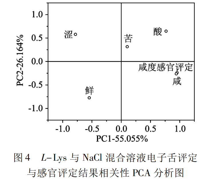對L-Lys 與 NaCl 混合溶液的感官咸度評分和電子舌所測得的咸、酸、苦、澀、鮮五組數(shù)據(jù)進行主成分分析,如圖 4 所示,PC1 和 PC2 累積方差貢獻率為81.219%,“感官咸度評分”和電子舌數(shù)據(jù)“咸”在圖上位 置 重 合,而與電子舌其他數(shù) 據(jù)“酸”、“苦”、“澀”、“鮮”距離很遠,說明電子舌對溶液咸度的評分“咸”與感官咸度評分相關性較高。
