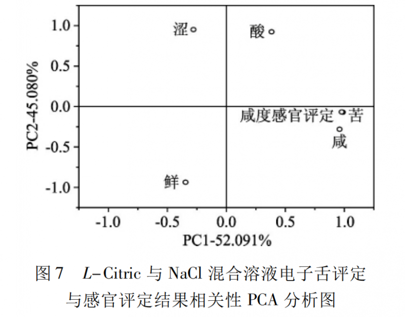 對L-Citric與 NaCl 混合溶液的感官咸度評分和電子舌所測得的咸、酸、苦、澀、鮮五組數(shù)據(jù)進行主成分分析。如圖 7 所 示,PC1 和 PC2 累積方差貢獻率為97.981%,“感官咸度評分”和電子舌數(shù)據(jù)“咸”在圖上位置相近,說明電子舌對溶液咸度的評分“咸”與感官咸度評分相關性較高。在 PCA 分析圖上,“感官咸度評分”除了與電子舌數(shù)據(jù)“咸”在圖上位置相近之外,還與電子舌數(shù)據(jù)“苦”有著非常近的距離。文中主要研究的是兩種方式對溶液咸度的評定,而沒有將苦味的感官評定和電子舌評定進行比較。在L-Citric與 NaCl 混合溶液味道的電子舌評定中,“苦”味可能受到其他味道的干擾而判斷有誤,導致其在 PCA 圖上與“感官咸度評分”相距很近,但不影響對“感官咸度評分”和“咸”之間相關性的分析。